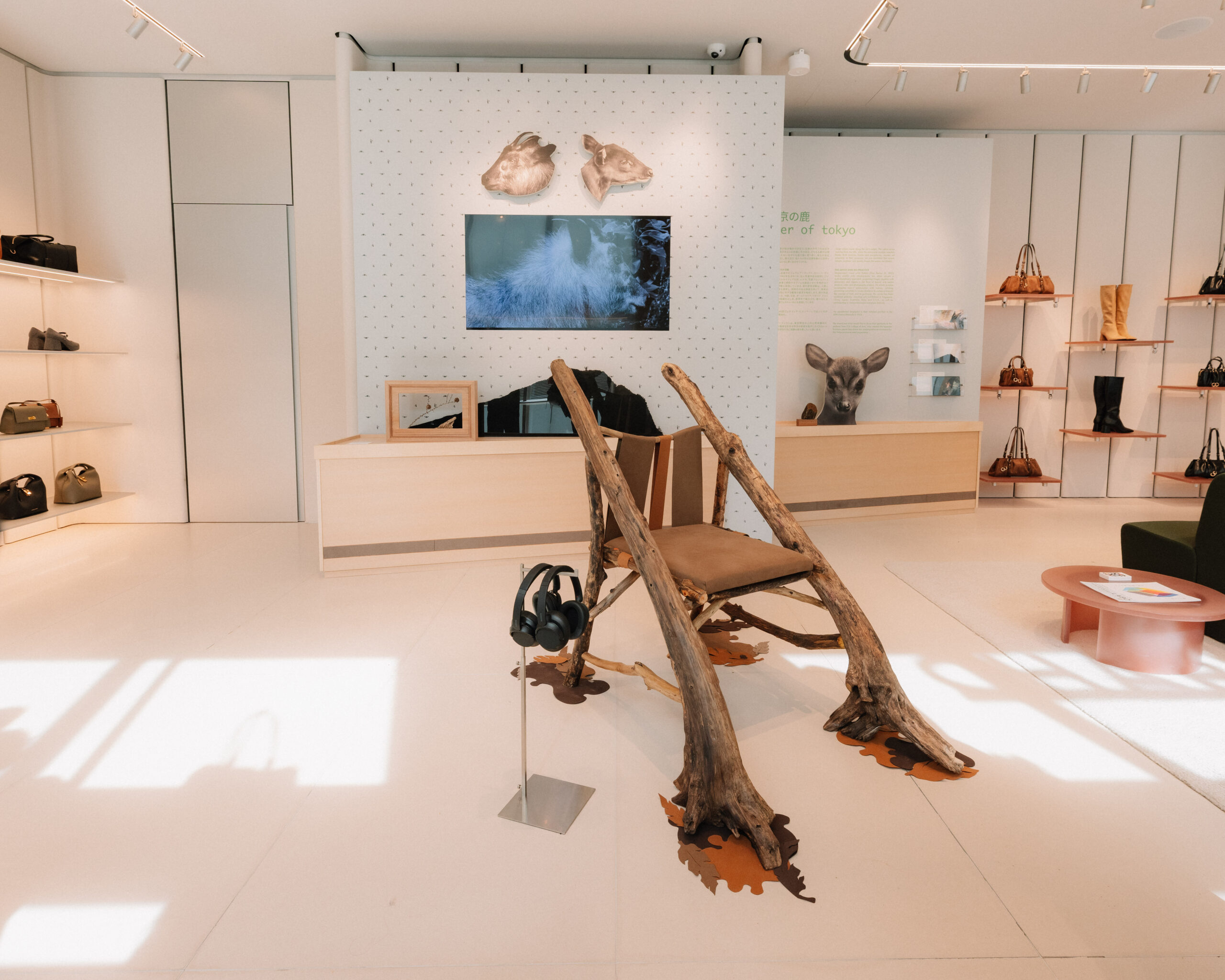 To realise the site-specific installation within the CHARLES & KEITH retail environment, Zhao has also partnered with students from ICS College of Arts, a specialist school for interior, furniture design and architecture in Tokyo, to create bespoke furniture pieces that shape the contemplative environment within the store. Display pedestals were conceived to hold delicate natural traces for close, intimate observation; whilst a sculptural viewing chair integrating deadstock fabrics from the brand’s Fall Winter 2025 collection, encourages visitors to engage in focused, contemplative video viewing. Together, these pieces merge utilitarian design with sensibility, grounding the space in a language of fieldwork and taxonomy with the brand’s minimalist ethos. Following the exhibition run, the furniture will then go on showcase at the CHARLES & KEITH’s Omotesando boutique for an extended display, highlighting the seasonal collection.